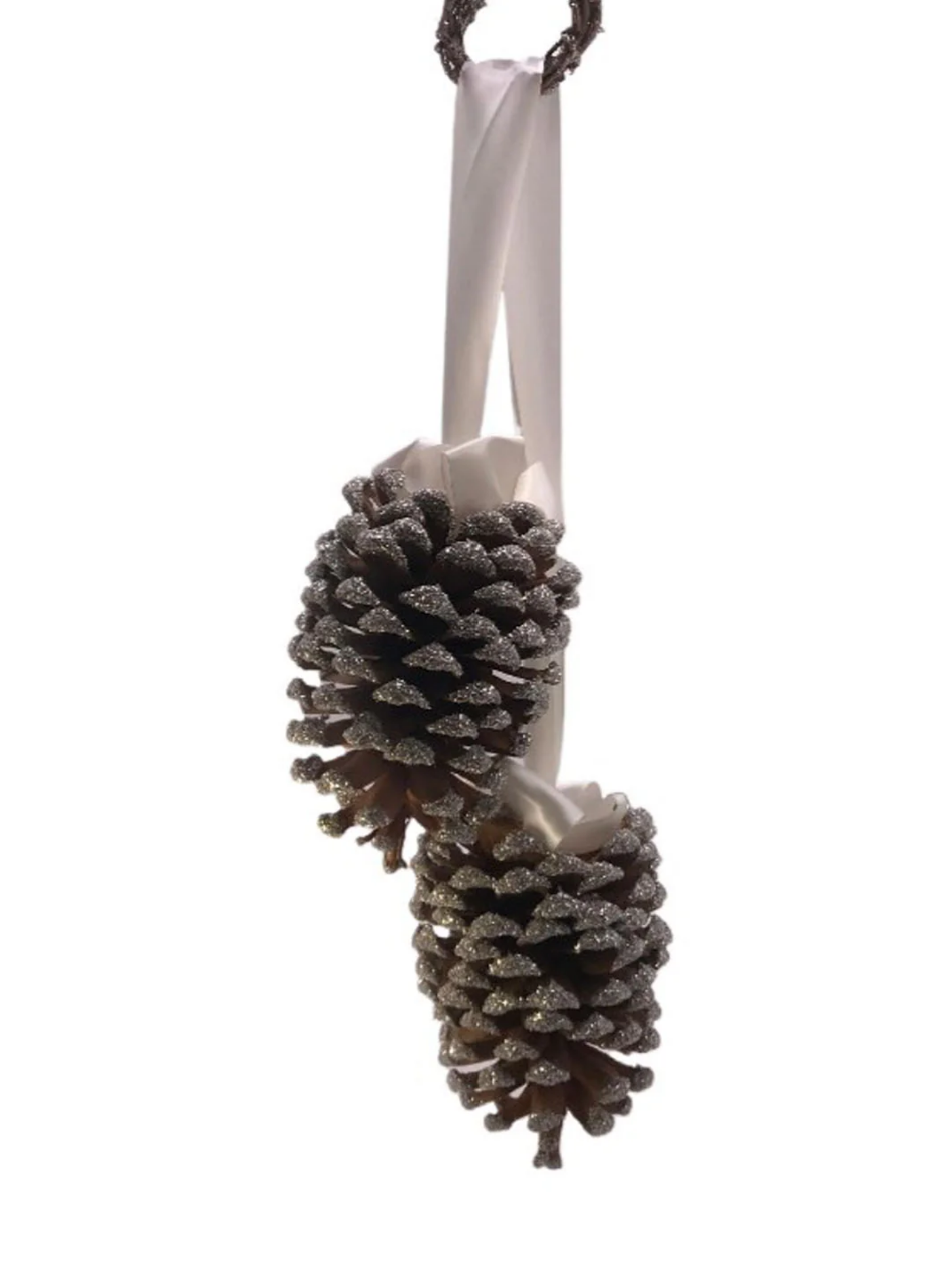 Two magnificent pinecones, adorned with the finest German silver glass glitter.