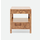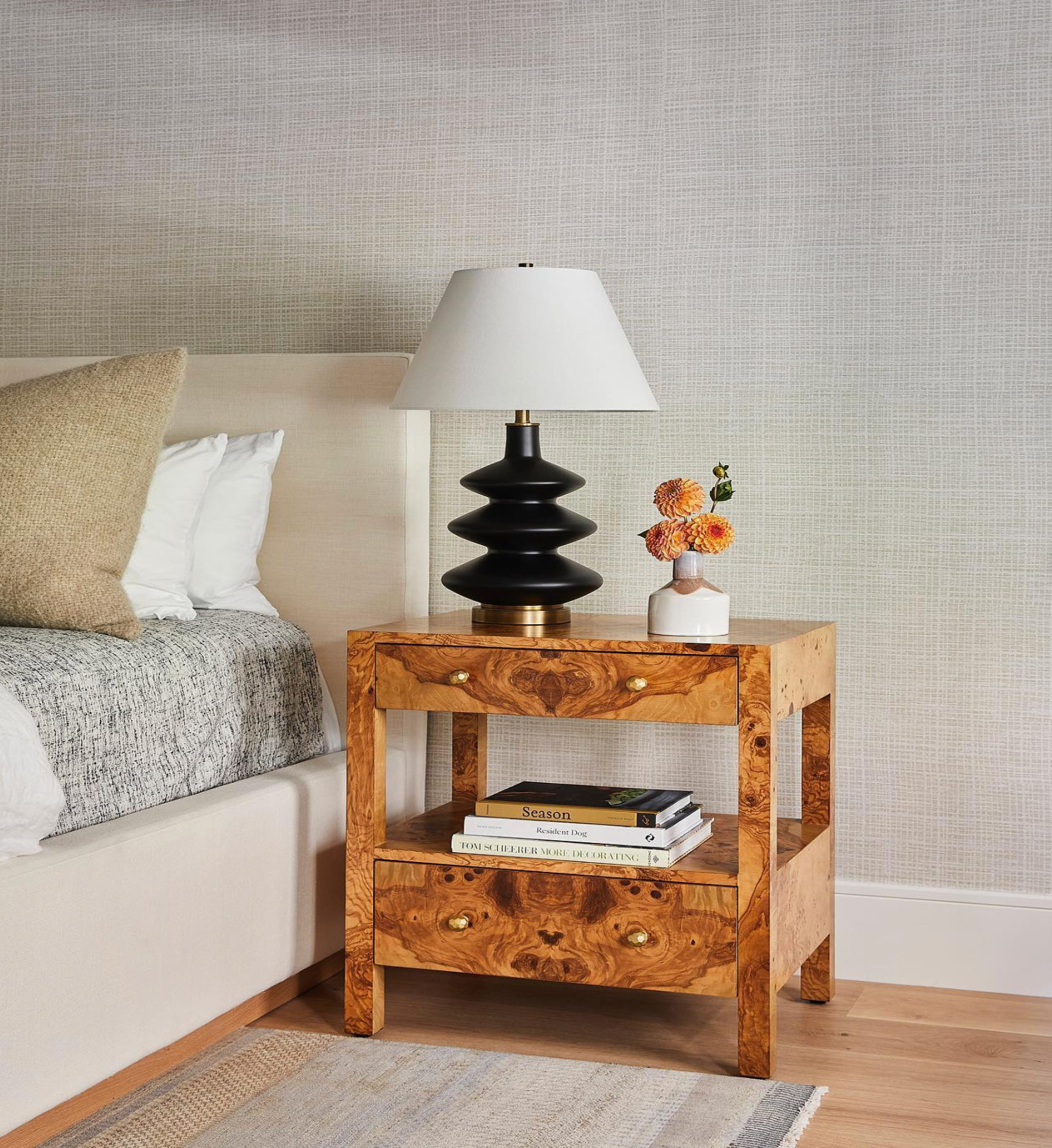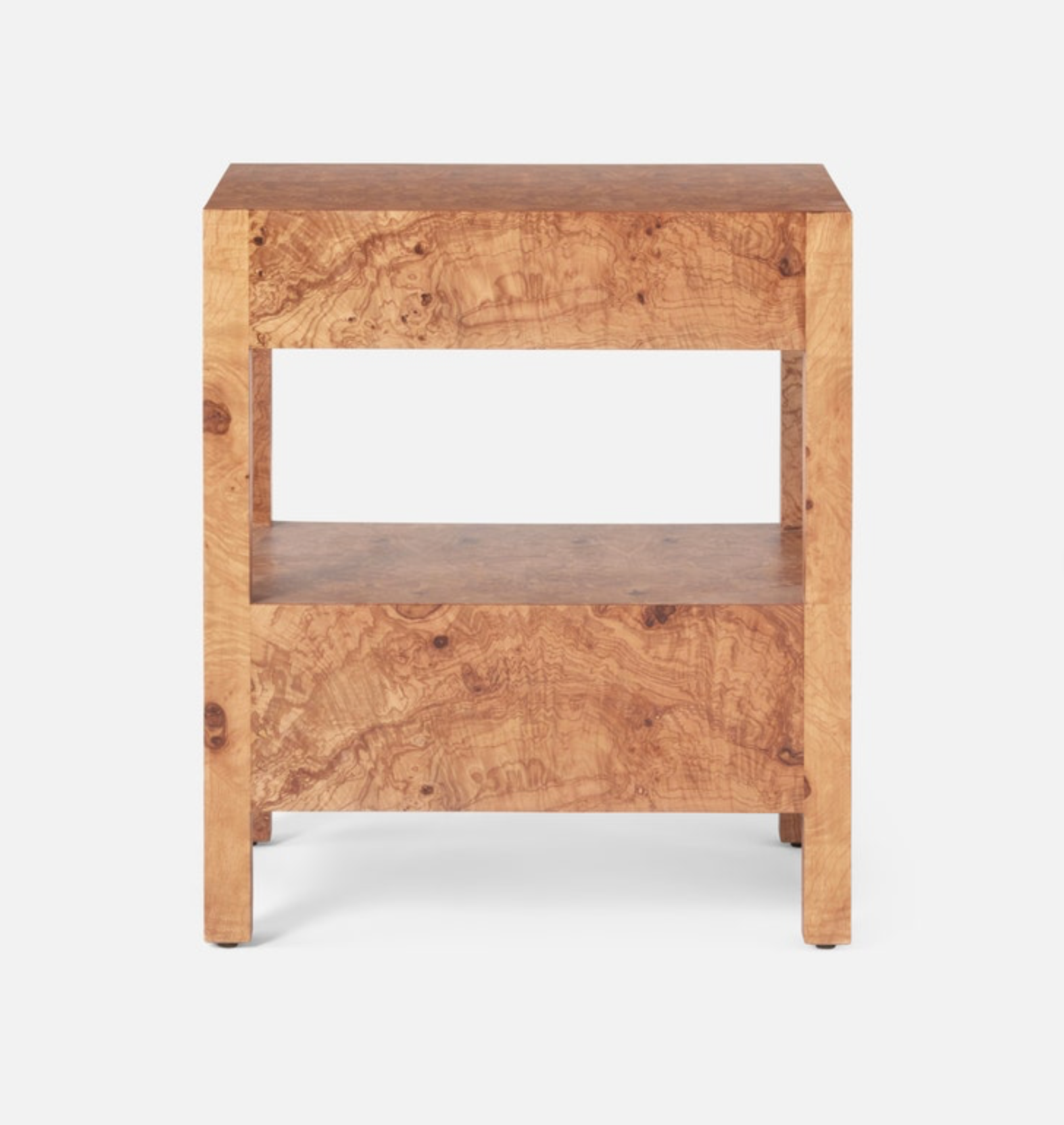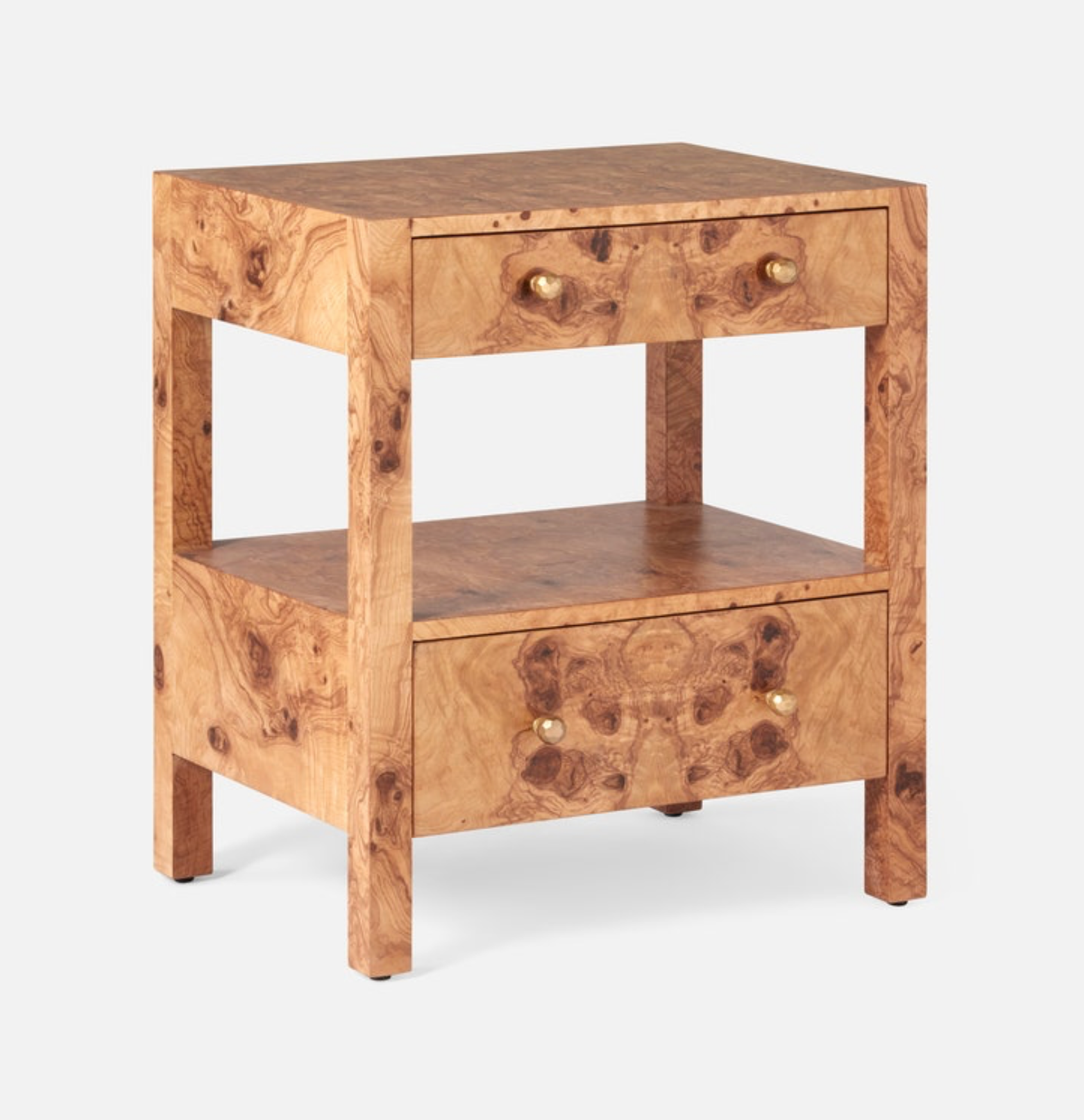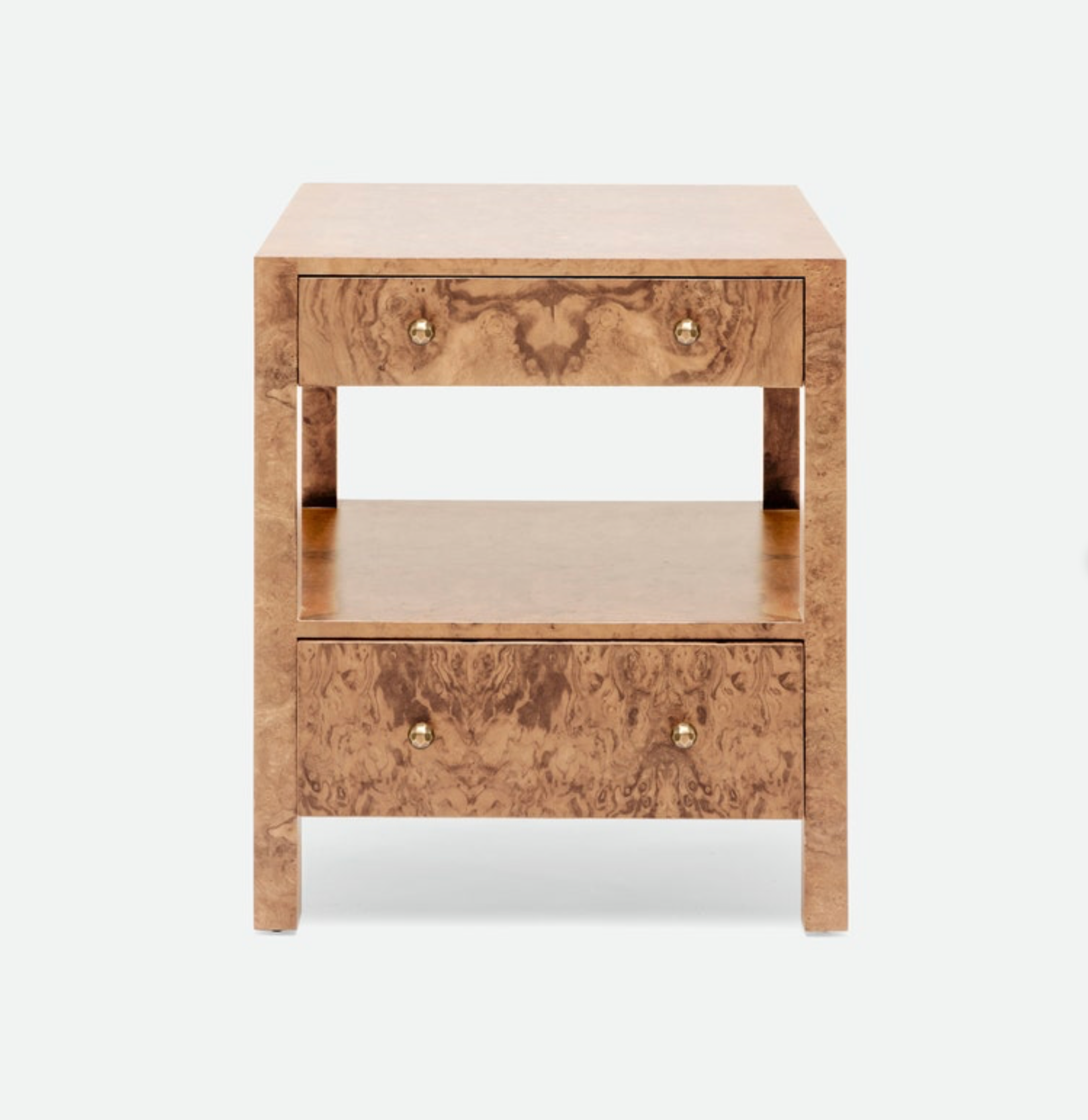 Burled wood veneer and faceted brass hardware adds a polished touch.